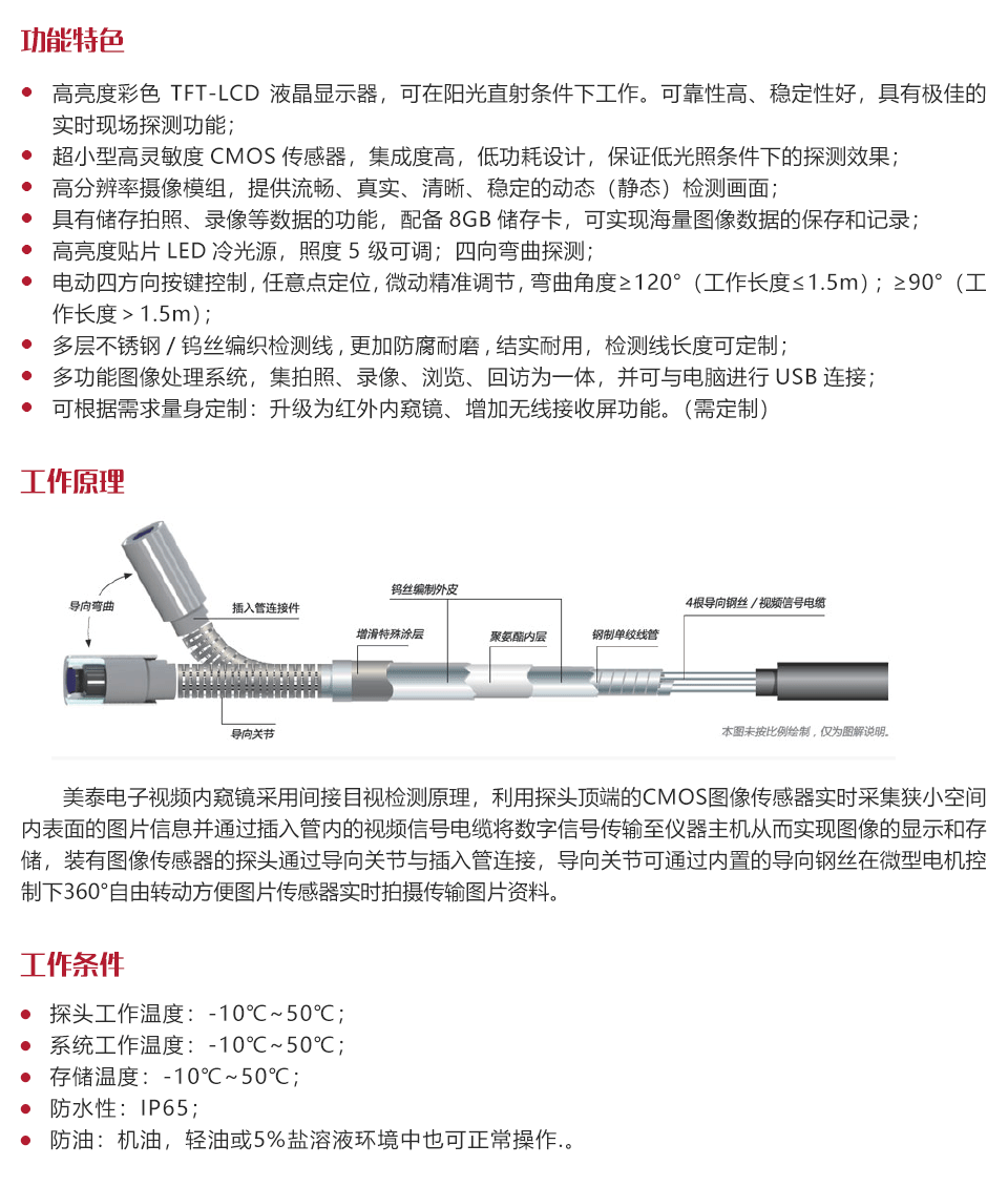 工作原理美泰電子視頻內(nèi)窺鏡采用間接目視檢測原理,利用探頭頂端的CMOS圖像傳感器實時采集狹小空間內(nèi)表面的圖片信息并通過插入管內(nèi)的視頻信號電纜將數(shù)字信號傳輸至儀器主機從而實現(xiàn)圖像的顯示和存儲,裝有圖像傳感器的探頭通過導(dǎo)向關(guān)節(jié)與插入管連接,導(dǎo)向關(guān)節(jié)可通過內(nèi)置的導(dǎo)向鋼絲在微型電機控制下360°自由轉(zhuǎn)動方便圖片傳感器實時拍攝傳輸圖片資料。