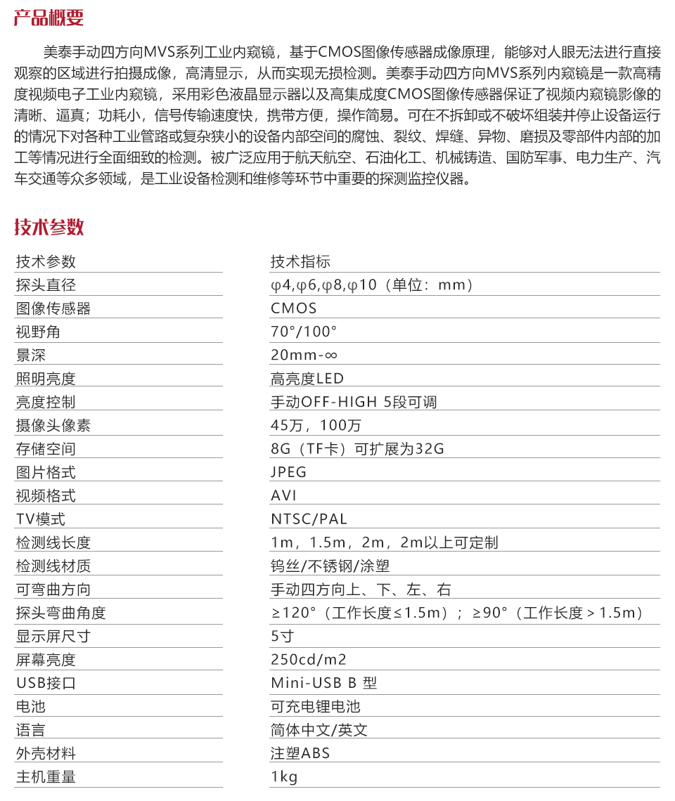 美泰手動(dòng)四方向MVS系列工業(yè)內(nèi)窺鏡,基于CMOS圖像傳感器成像原理,能夠對人眼無法進(jìn)行直接觀察的區(qū)域進(jìn)行拍攝成像,高清顯示,從而實(shí)現(xiàn)無損檢測。美泰手動(dòng)四方向MVS系列內(nèi)窺鏡是一款高精度視頻電子工業(yè)內(nèi)窺鏡,采用彩色液晶顯示器以及高集成度CMOS圖像傳感器保證了視頻內(nèi)窺鏡影像的清晰、逼真;功耗小,信號(hào)傳輸速度快,攜帶方便,操作簡易。可在不拆卸或破壞組裝停止設(shè)備運(yùn)行的情況下對各種工業(yè)管路或復(fù)雜狹小的設(shè)備內(nèi)部空間的腐蝕、裂紋、焊縫、異物、磨損及零部件內(nèi)部的加工等情況進(jìn)行全面細(xì)致的檢測。被廣泛應(yīng)用于航天航空、石油化工、機(jī)械鑄造、國防軍事、電力生產(chǎn)、汽車交通等眾多領(lǐng)域,是工業(yè)設(shè)備檢測和維修等環(huán)節(jié)中重要的探測監(jiān)控儀器。