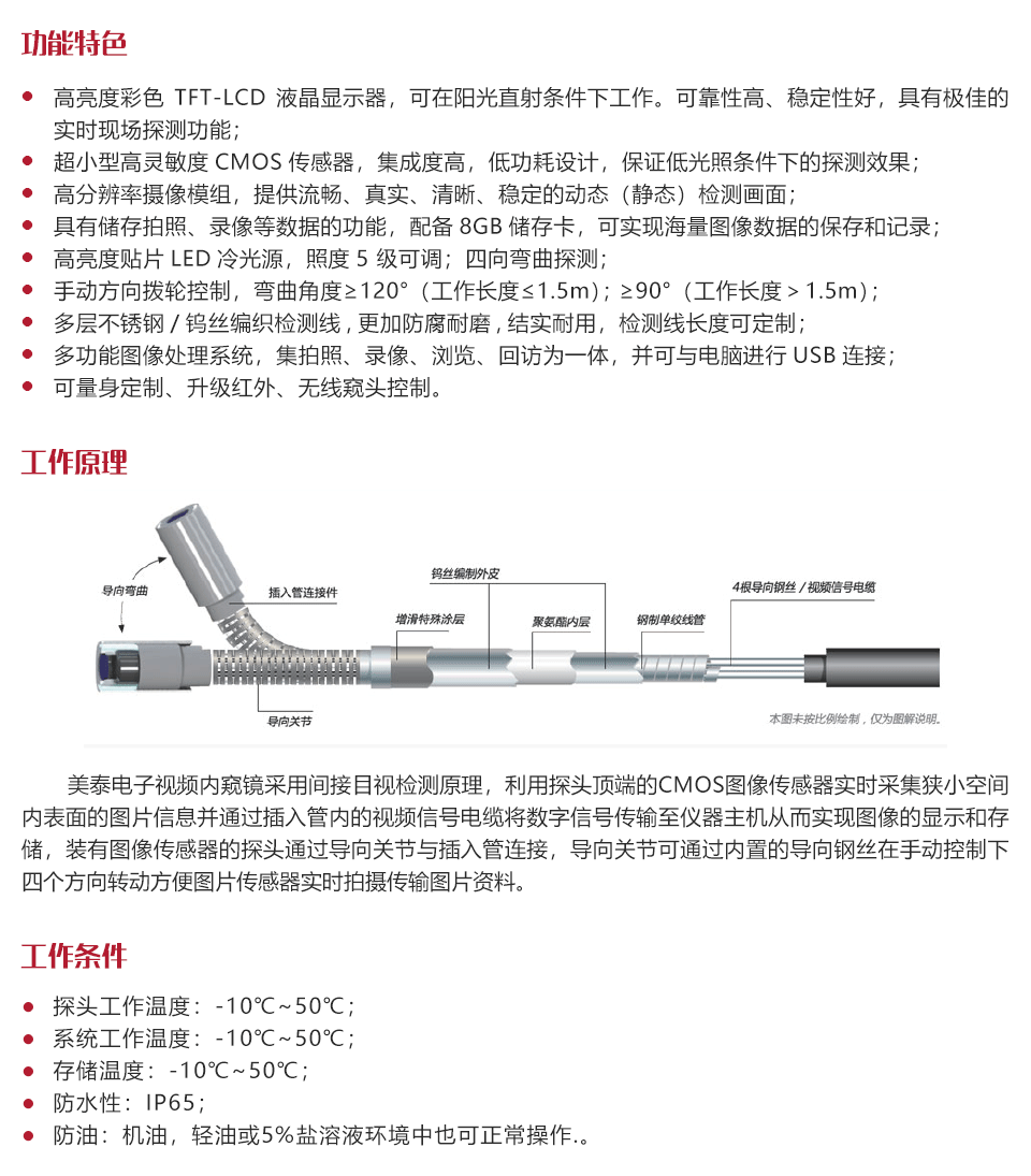 美泰電子視頻內(nèi)窺鏡采用間接目視檢測原理,利用探頭頂端的CMOS圖像傳感器實(shí)時(shí)采集狹小空間內(nèi)表面的圖片信息并通過插入管內(nèi)的視頻信號(hào)電纜數(shù)字信號(hào)傳輸至儀器主機(jī)從而實(shí)現(xiàn)圖像的顯示和存儲(chǔ),裝有圖像傳感器的探頭通過導(dǎo)向關(guān)節(jié)與插入管連接,導(dǎo)向關(guān)節(jié)可通過內(nèi)置的導(dǎo)向鋼絲在手動(dòng)控制下四個(gè)方向轉(zhuǎn)動(dòng)方便圖片傳感器實(shí)時(shí)拍攝傳輸圖片資料。