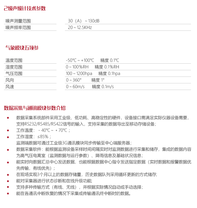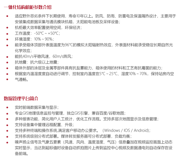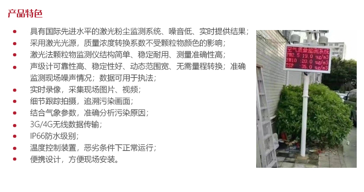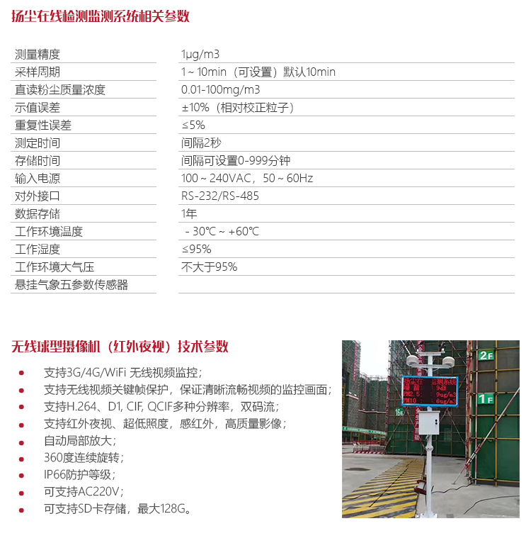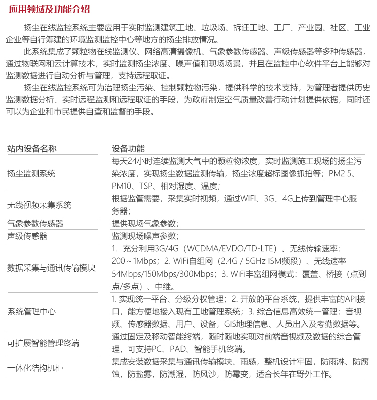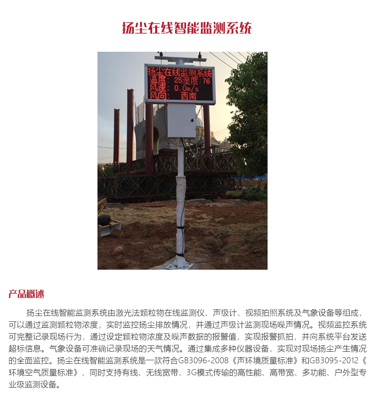 產(chǎn)品概述揚(yáng)塵在線智能監(jiān)測(cè)系統(tǒng)由激光法顆粒物在線監(jiān)測(cè)儀、聲級(jí)計(jì)、視頻拍照系統(tǒng)及氣象設(shè)備等組成,可以通過(guò)監(jiān)測(cè)顆粒物濃度,實(shí)時(shí)監(jiān)控?fù)P塵排放情況,并通過(guò)聲級(jí)計(jì)監(jiān)測(cè)現(xiàn)場(chǎng)噪聲情況。視頻監(jiān)控系統(tǒng)可完整記錄現(xiàn)場(chǎng)行為,通過(guò)設(shè)定顆粒物濃度及噪聲數(shù)據(jù)的報(bào)警值,實(shí)現(xiàn)報(bào)警抓拍,并向系統(tǒng)平臺(tái)發(fā)送超標(biāo)信息。氣象設(shè)備可準(zhǔn)確記錄現(xiàn)場(chǎng)的天氣情況。通過(guò)集成多種儀器設(shè)備,實(shí)現(xiàn)對(duì)現(xiàn)場(chǎng)揚(yáng)塵產(chǎn)生情況的全面監(jiān)控。揚(yáng)塵在線智能監(jiān)測(cè)系統(tǒng)是一款符合GB3096-2008《聲環(huán)境質(zhì)量標(biāo)準(zhǔn)》和GB3095-2012《環(huán)境空氣質(zhì)量標(biāo)準(zhǔn)》,同時(shí)支持有線、無(wú)線寬帶、3G模式傳輸?shù)母咝阅堋⒏邘?、多功能、戶外型專業(yè)級(jí)監(jiān)測(cè)設(shè)備。