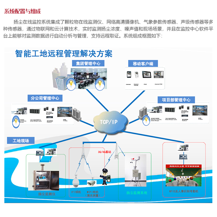 此系統(tǒng)集成了顆粒物在線監(jiān)測(cè)儀、網(wǎng)絡(luò)高清攝像機(jī)、氣象參數(shù)傳感器、聲級(jí)傳感器等多種傳感器,通過(guò)物聯(lián)網(wǎng)和云計(jì)算技術(shù),實(shí)時(shí)監(jiān)測(cè)揚(yáng)塵濃度、噪聲值和現(xiàn)場(chǎng)場(chǎng)景,并且在監(jiān)控中心軟件平臺(tái)上能夠?qū)ΡO(jiān)測(cè)數(shù)據(jù)進(jìn)行自動(dòng)分析與管理,支持遠(yuǎn)程取證。