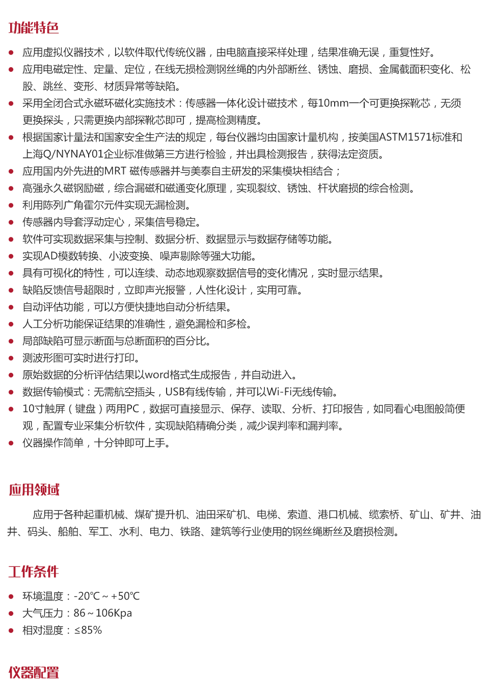 產(chǎn)品概述美泰MRT80-S無線傳輸型鋼絲繩探傷儀是美泰公司基于原有的鋼絲繩探傷儀研發(fā)的系列升級產(chǎn)品。該產(chǎn)品基于漏磁原理,可實時檢測鋼絲繩內(nèi)外部的斷絲、銹蝕、磨損等缺陷,能夠計算出金屬截面積變化的定量數(shù)值,可按照現(xiàn)行標準和規(guī)程生成診斷報告。硬件部分采用國際先進的MRT磁傳感器,配合功能型數(shù)據(jù)采集模塊進行工作,增設(shè)了USB接口及WIFI無線傳輸功能,可直接將數(shù)據(jù)存儲到計算機中;軟件部分基于小波變換分析原理,可實現(xiàn)數(shù)據(jù)的采集、控制、分析、顯示與存儲等功能;借助特有的動態(tài)連續(xù)跟蹤方式,可以連續(xù)、動態(tài)地觀察數(shù)據(jù)信號的變化情況,并實時顯示檢測結(jié)果,實時發(fā)出報警信號;兼?zhèn)渥詣釉u估功能。該儀器攜帶方便,操作簡單,檢測精度高,重復性好,損傷定位準確,被廣泛應用于各種起重機械、煤礦提升機、油田采礦機、電梯、索道、港口機械、纜索橋、礦山、礦井、油井、碼頭、船舶、軍工、水利、電力、鐵路、建筑等行業(yè)使用的鋼絲繩斷絲及磨損檢測。