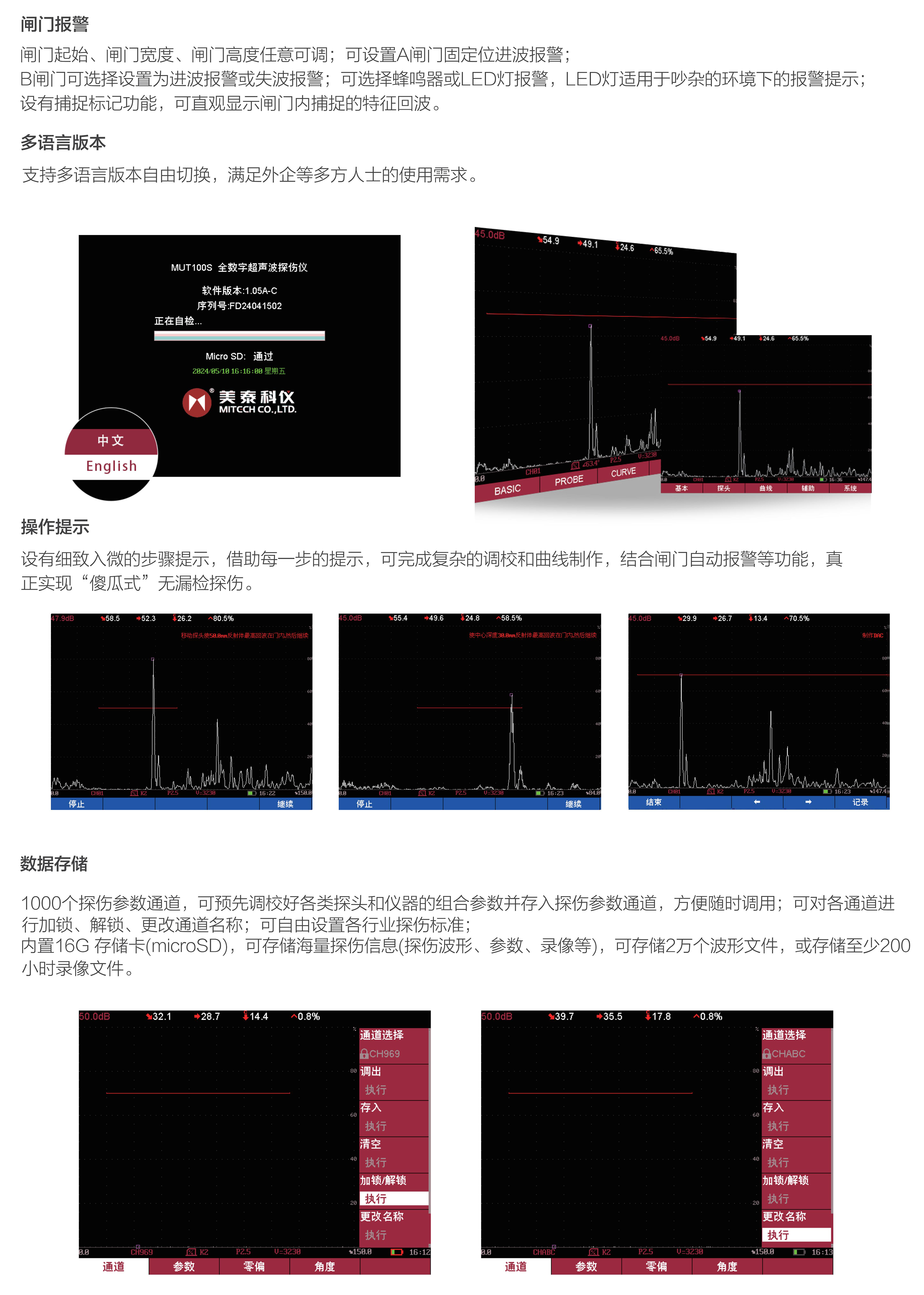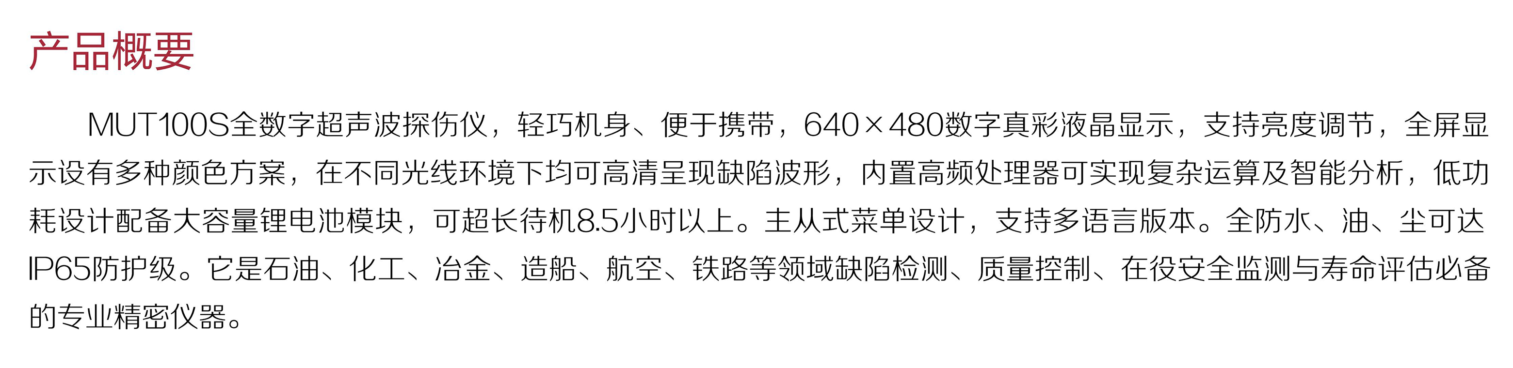 產品概述MUT100S全數(shù)字超聲波探傷儀,輕巧機身、便于攜帶,640×480數(shù)字真彩液晶顯示,支持亮度調節(jié),全屏顯示設有多種顏色方案,在不同光線環(huán)境下均可高清呈現(xiàn)缺陷波形,內置高頻處理器可實現(xiàn)復雜運算及智能分析,低功耗設計配備大容量鋰電池模塊,可超長待機8.5小時以上。主從式菜單設計,支持多語言版本。全防水、油、塵可達IP65防護級。它是石油、化工、冶金、造船、航空、鐵路等領域缺陷檢測、質量控制、在役安全監(jiān)測與壽命評估必備的專業(yè)精密儀器。