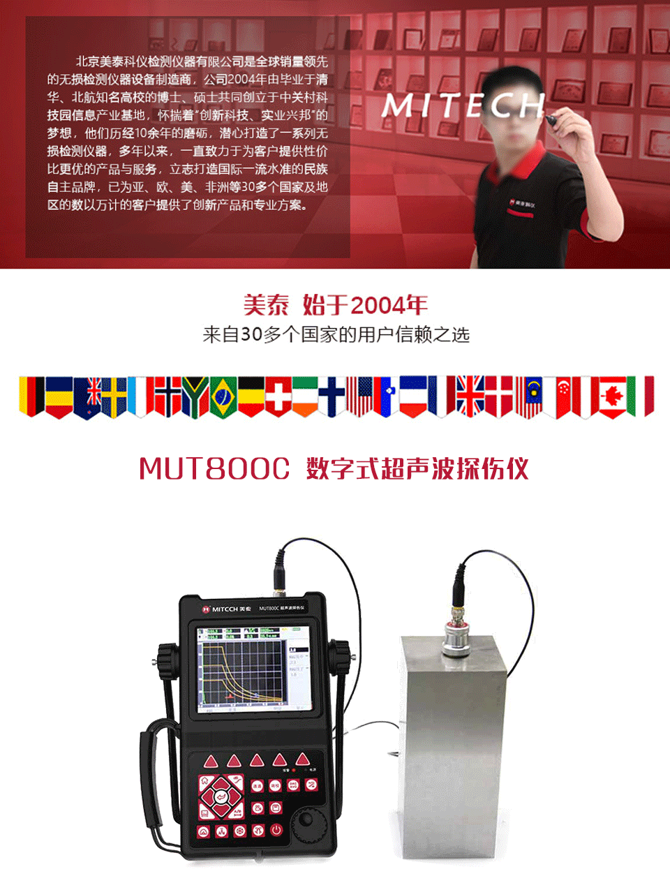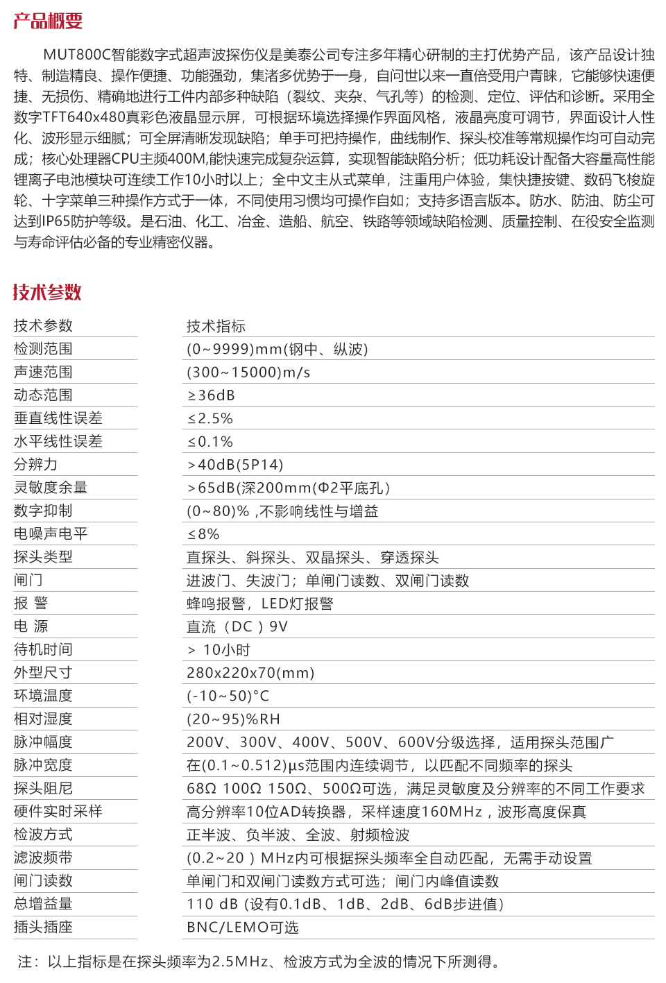 產(chǎn)品概述MUT800C智能數(shù)字式超聲波探傷儀是美泰公司專注多年精心研制的主打優(yōu)勢產(chǎn)品,該產(chǎn)品設(shè)計(jì)獨(dú)特、制造精良、操作便捷、功能強(qiáng)勁,集諸多優(yōu)勢于一身,自問世以來一直倍受用戶親睞,它能夠快速便捷、無損傷、精確地進(jìn)行工件內(nèi)部多種缺陷(裂紋、夾雜、氣孔等)的檢測、定位、評估和診斷。采用全數(shù)字TFT 640×480真彩色液晶顯示屏,可根據(jù)環(huán)境選擇操作界面風(fēng)格,液晶亮度可調(diào)節(jié),界面設(shè)計(jì)人性化、波形顯示細(xì)膩;可全屏清晰發(fā)現(xiàn)缺陷;單手可把持操作,曲線制作、探頭校準(zhǔn)等常規(guī)操作均可自動完成;核心處理器CPU主頻400M,能快速完成復(fù)雜運(yùn)算,實(shí)現(xiàn)智能缺陷分析;低功耗設(shè)計(jì)配備大容量高性能鋰離子電池模塊可連續(xù)工作10小時以上;全中文主從式菜單,注重用戶體驗(yàn),集快捷按鍵、數(shù)碼飛梭旋輪、十字菜單三種操作方式于一體,不同使用習(xí)慣均可操作自如;支持多語言版本。防水、防油、防塵可達(dá)到IP65防護(hù)等級。是石油、化工、冶金、造船、航空、鐵路等領(lǐng)域缺陷檢測、質(zhì)量控制、在役安全監(jiān)測與壽命評估必備的專業(yè)精密儀器。