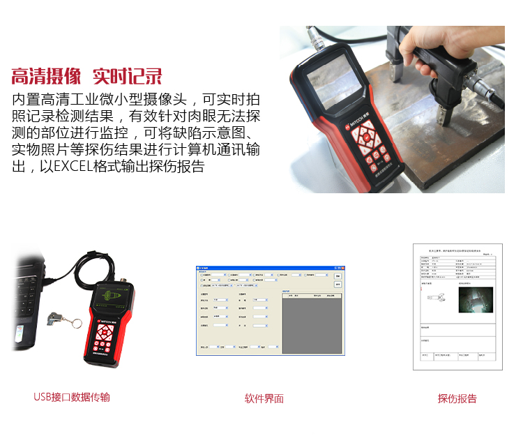 ?內(nèi)置工業(yè)高清微小型攝像頭,可實(shí)時拍照記錄檢測結(jié)果,有效針對肉眼無法檢測的部位進(jìn)行監(jiān)控,可將缺陷示意圖、實(shí)物照片等探傷結(jié)果進(jìn)行計(jì)算機(jī)通訊輸出,以Excel格式導(dǎo)出探傷報(bào)告。