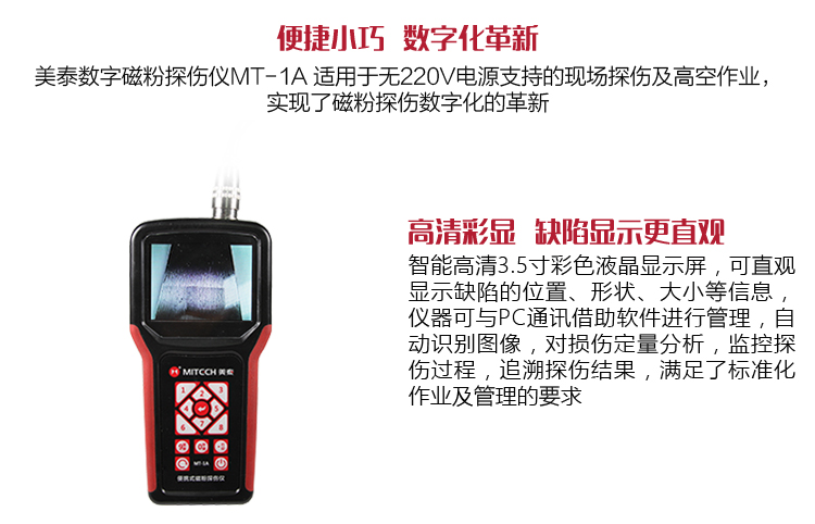 產(chǎn)品概述MT-1A型便攜式數(shù)字磁粉探傷儀,采用大容量鋰電池組供電,將充電電池提供的直流電經(jīng)過變頻逆變和信號移相處理,為磁粉探傷提供磁化電源,解決了傳統(tǒng)磁粉探傷儀依賴220V電源的弊端;功耗低,一次充電可連續(xù)工作4小時以上,電池可以在線充電和脫機(jī)充電??蓪μ絺^程進(jìn)行實(shí)時監(jiān)控,具備圖像處理功能,可存儲數(shù)據(jù)、打印測試報(bào)告、跟蹤追溯探傷結(jié)果,滿足了標(biāo)準(zhǔn)化作業(yè)及管理的要求。特別適用于野外無電源的現(xiàn)場探傷及高空作業(yè),它實(shí)現(xiàn)了磁粉探傷數(shù)字化的革新。
