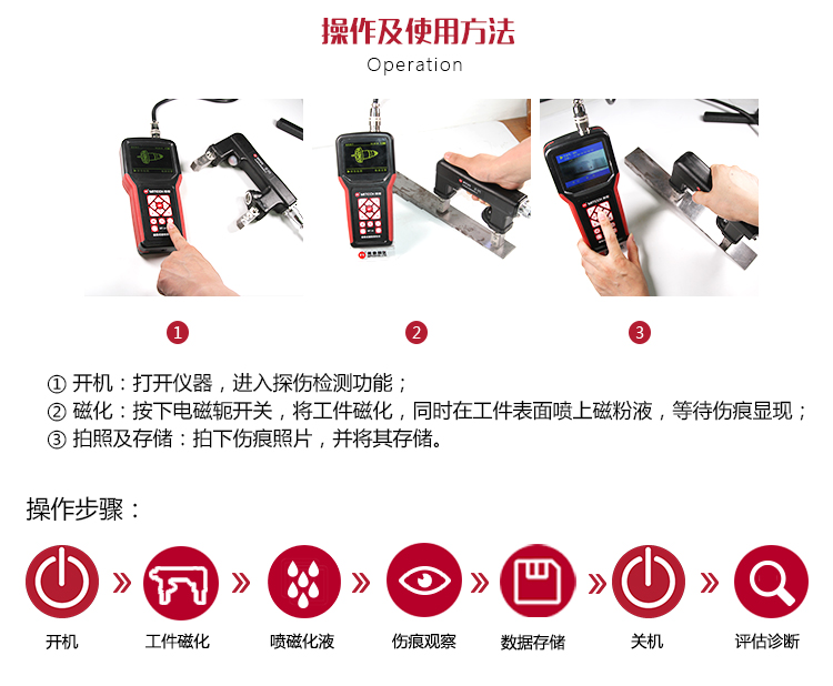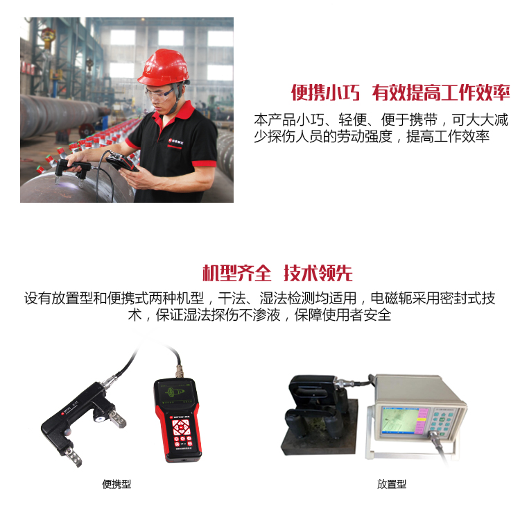 ?設(shè)有放置型和便攜型兩種機(jī)型,干法、濕法檢測均適用,電磁軛采用密封式技術(shù),保證濕法探傷不滲液,保障使用者安全。