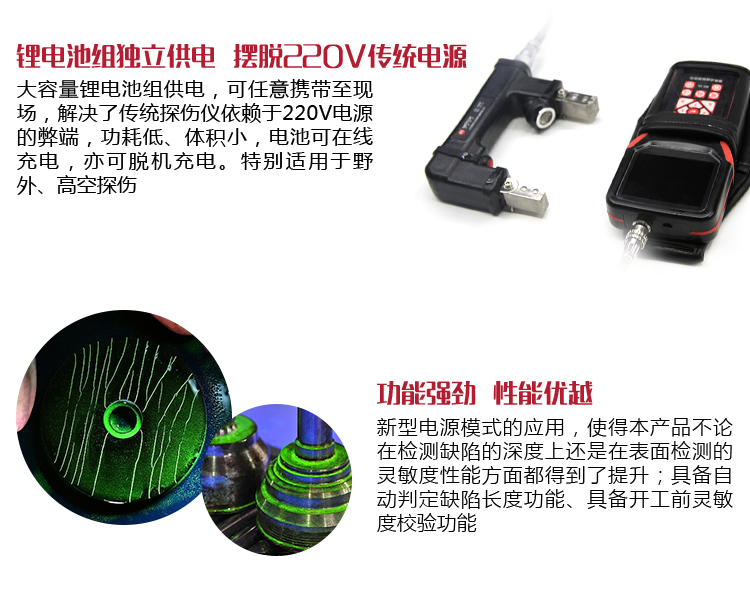 ?新型電源模式的應(yīng)用,使本產(chǎn)品不論在檢測缺陷的深度還是在表面檢測的靈敏度性能方面都得到了提升;具備自動判定缺陷長度功能、具備開工前靈敏度校驗(yàn)功能。