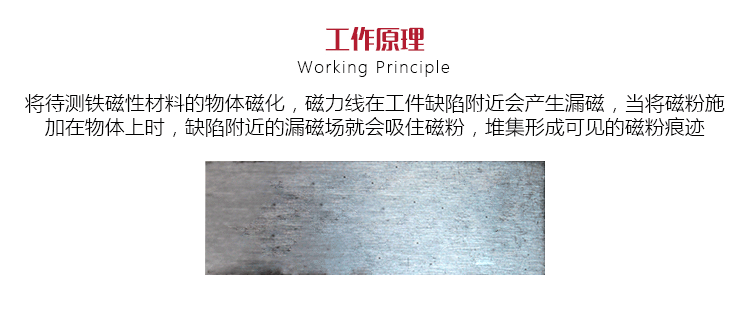 工作原理將待測鐵磁性材料的物體置于強(qiáng)磁場中或通以強(qiáng)大電流使之磁化,若物體表面或表面附近存有缺陷(裂紋、折疊、夾雜物等),磁力線在這些缺陷附近會產(chǎn)生漏磁,當(dāng)將導(dǎo)磁性良好的磁粉(通常為磁性氧化鐵粉)施加在物體上時,缺陷附近的漏磁場就會吸住磁粉,堆集形成可見的磁粉痕跡,在合適的光照下形成可見的磁痕,從而顯示出連續(xù)性的位置、大小、形狀和嚴(yán)重程度,將缺陷顯示出來。