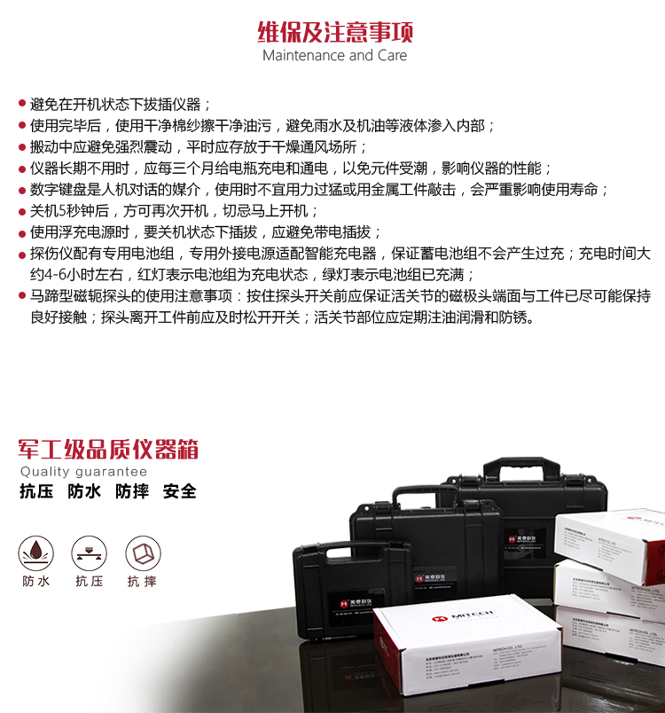 儀器的保養(yǎng)與維護(hù)數(shù)字便攜式磁粉探傷儀屬于精密檢測儀器,使用中要注意下列事項(xiàng):