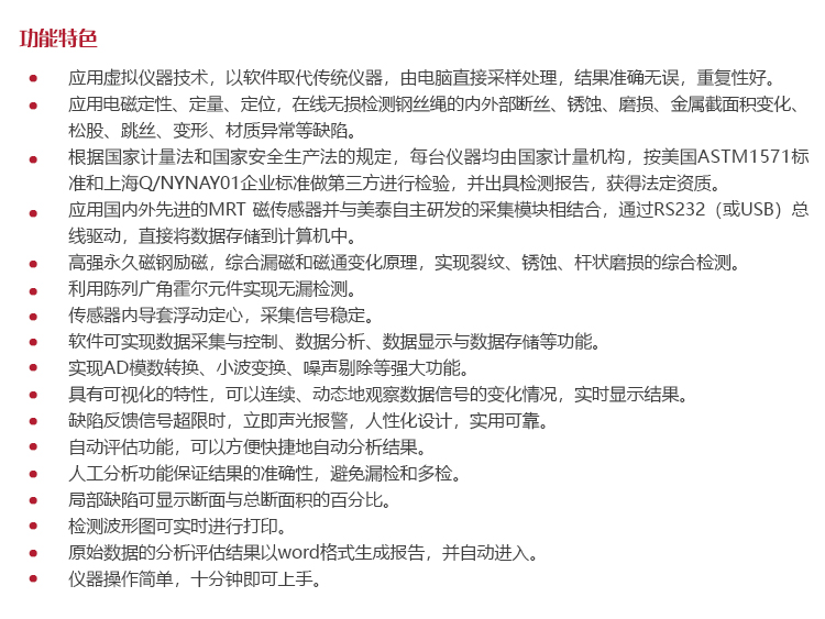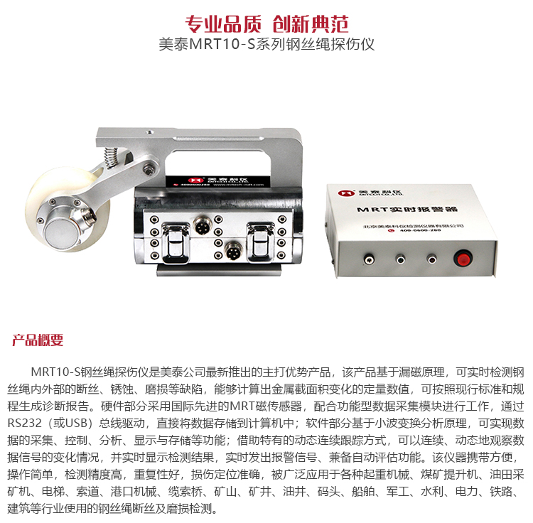 MRT10-S鋼絲繩探傷儀是美泰公司最新研發(fā)的無損檢測產(chǎn)品,該產(chǎn)品基于漏磁原理,可實(shí)時檢測鋼絲繩內(nèi)外部的斷絲、銹蝕、磨損等缺陷,能夠計(jì)算出金屬截面積變化的定量數(shù)值,可按照現(xiàn)行標(biāo)準(zhǔn)和規(guī)程生成診斷報(bào)告。硬件部分采用國際先進(jìn)的MRT磁傳感器,配合功能型數(shù)據(jù)采集模塊進(jìn)行工作,通過RS232(或USB)總線驅(qū)動,直接將數(shù)據(jù)存儲到計(jì)算機(jī)中;軟件部分基于小波變換分析原理,可實(shí)現(xiàn)數(shù)據(jù)的采集、控制、分析、顯示與存儲等功能;借助特有的動態(tài)連續(xù)跟蹤方式,可以連續(xù)、動態(tài)地觀察數(shù)據(jù)信號的變化情況,并實(shí)時顯示檢測結(jié)果,實(shí)時發(fā)出報(bào)警信號;兼?zhèn)渥詣釉u估功能。該儀器攜帶方便,操作簡單,檢測精度高,重復(fù)性好,損傷定位準(zhǔn)確,被廣泛應(yīng)用于各種起重機(jī)械、煤礦提升機(jī)、油田采礦機(jī)、電梯、索道、港口機(jī)械、纜索橋、礦山、礦井、油井、碼頭、船舶、軍工、水利、電力、鐵路、建筑等行業(yè)使用的鋼絲繩斷絲及磨損檢測。