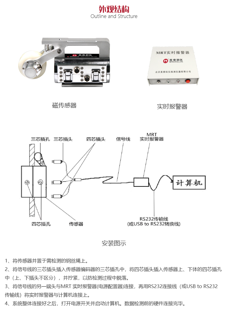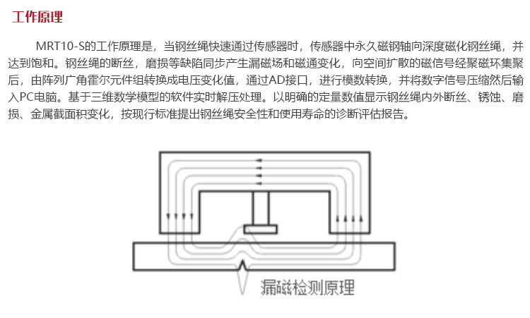 MRT10-S的工作原理是,當(dāng)鋼絲繩快速通過傳感器時,傳感器中永久磁鋼軸向深度磁化鋼絲繩,并達(dá)到飽和。鋼絲繩的斷絲,磨損等缺陷同步產(chǎn)生漏磁場和磁通變化,向空間擴(kuò)散的磁信號經(jīng)聚磁環(huán)集聚后,由陣列廣角霍爾元件組轉(zhuǎn)換成電壓變化值,通過AD接口,進(jìn)行模數(shù)轉(zhuǎn)換,并將數(shù)字信號壓縮然后輸入PC電腦。基于三維數(shù)學(xué)模型的軟件實(shí)時解壓處理。以明確的定量數(shù)值顯示鋼絲繩內(nèi)外斷絲、銹蝕、磨損、金屬截面積變化,按現(xiàn)行標(biāo)準(zhǔn)提出鋼絲繩安全性和使用壽命的診斷評估報(bào)告。