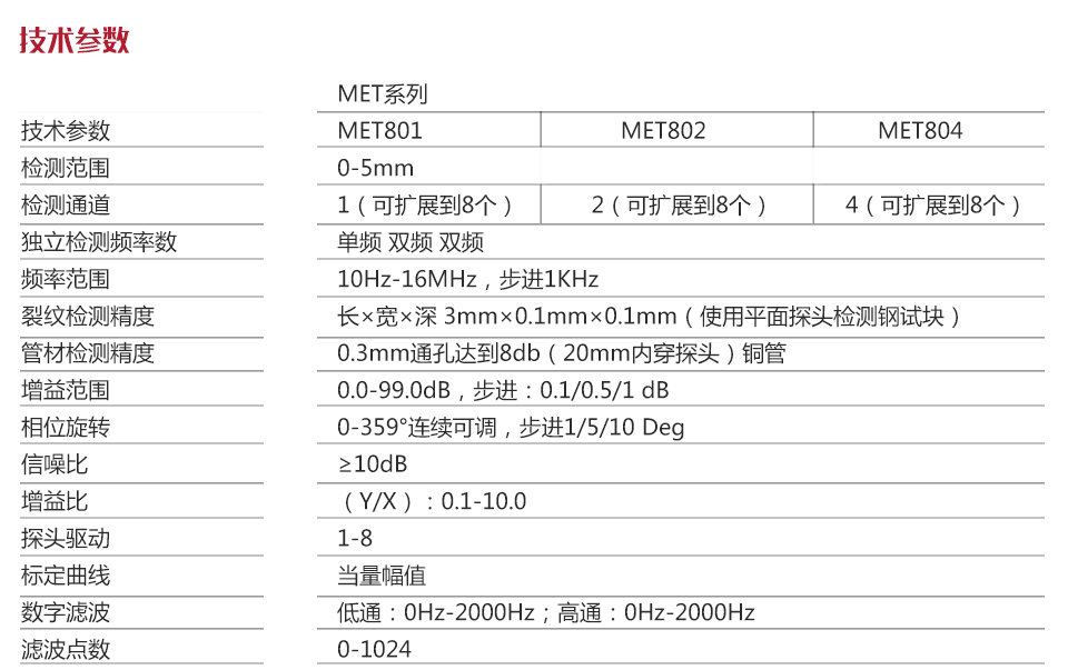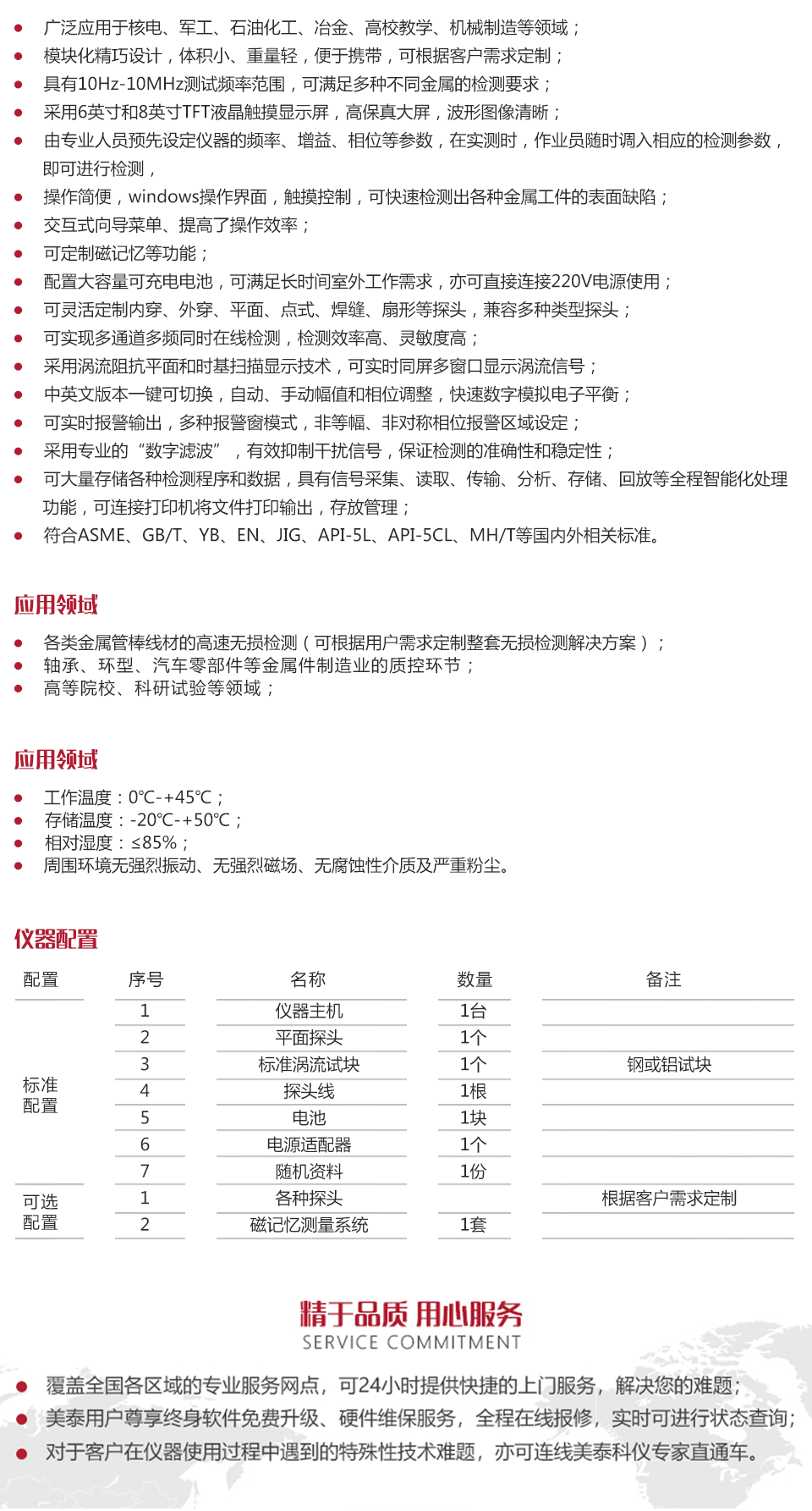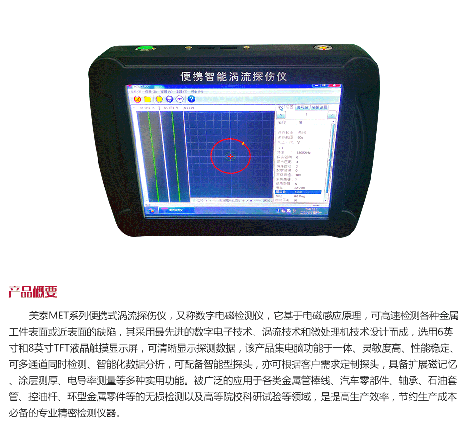 產(chǎn)品概述美泰MET系列便攜式渦流探傷儀,又稱數(shù)字電磁檢測(cè)儀,它基于電磁感應(yīng)原理,可高速檢測(cè)各種金屬工件表面或近表面的缺陷,其采用最先進(jìn)的數(shù)字電子技術(shù)、渦流技術(shù)和微處理機(jī)技術(shù)設(shè)計(jì)而成,選用6英寸和8英寸TFT液晶觸摸顯示屏,可清晰顯示探測(cè)數(shù)據(jù),該產(chǎn)品集電腦功能于一體、靈敏度高、性能穩(wěn)定、可多通道同時(shí)檢測(cè)、智能化數(shù)據(jù)分析,可配備智能型探頭,亦可根據(jù)客戶需求定制探頭,具備擴(kuò)展磁記憶、涂層測(cè)厚、電導(dǎo)率測(cè)量等多種實(shí)用功能。被廣泛的應(yīng)用于各類金屬管棒線、汽車零部件、軸承、石油套管、控油桿、環(huán)型金屬零件等的無(wú)損檢測(cè)以及高等院??蒲性囼?yàn)等領(lǐng)域,是提高生產(chǎn)效率,節(jié)約生產(chǎn)成本必備的專業(yè)精密檢測(cè)儀器。