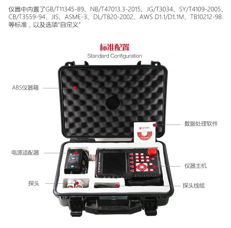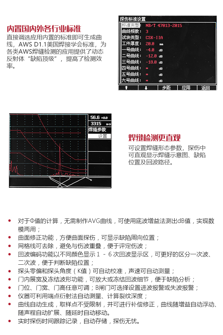 | 探傷標(biāo)準(zhǔn) | 內(nèi)置各行業(yè)常用探傷標(biāo)準(zhǔn),直接調(diào)用,方便、快捷 |