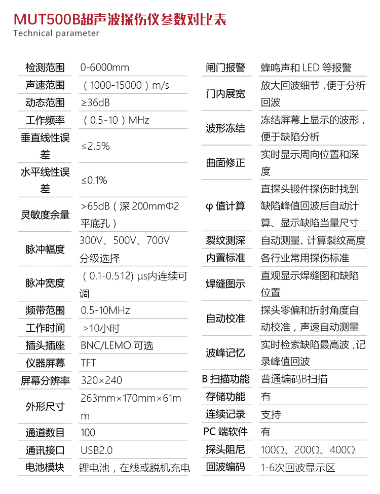 產(chǎn)品概述MUT500B是一款便攜式、全數(shù)字式超聲波探傷儀,能夠快速便捷、無損傷、精確地進行工件內(nèi)部多種缺陷(裂紋、夾雜、氣孔等)的檢測、定位、評估和診斷。既可以用于實驗室,也可以用于工程現(xiàn)場。 0-6000mm量程可滿足制造業(yè)、鋼鐵冶金業(yè)、金屬加工業(yè)、化工業(yè)等常規(guī)的缺陷需求,低功耗設(shè)計配備大容量高性能離子電池模塊可超長待機數(shù)月以上;質(zhì)優(yōu)價廉,是實用經(jīng)濟款超聲檢測儀器的首選。