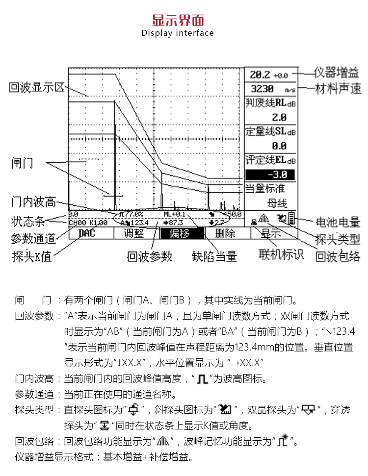 ?自動關(guān)機:當(dāng)電池電壓太低時,屏幕上的電池圖標(biāo)會閃爍顯示,然后探傷儀會自動關(guān)機斷電。