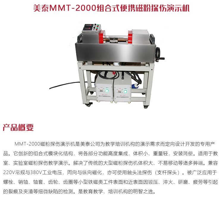 產(chǎn)品概述MMT-2000磁粉探傷演示機(jī)是美泰公司為教學(xué)培訓(xùn)機(jī)構(gòu)的演示需求而定向設(shè)計(jì)開(kāi)發(fā)的專(zhuān)用產(chǎn)品。它創(chuàng)新的組合式模塊化結(jié)構(gòu),將各部分功能高度集成,體積小、重量輕,安裝簡(jiǎn)便。適用于教室、實(shí)驗(yàn)室磁粉探傷教學(xué)演示。解決了傳統(tǒng)的大型磁粉探傷機(jī)體積大、不易移動(dòng)等諸多弊端。兼容220V常規(guī)與380V工業(yè)電壓,周向與縱向磁化,亦可使用觸頭法探傷(支桿探頭)。被廣泛應(yīng)用于螺栓、銷(xiāo)軸、軸套、齒輪、齒圈等小型鐵磁類(lèi)工件表面和近表面因鍛壓、淬火、研磨、疲勞等引起的裂痕及夾渣等細(xì)微缺陷的檢測(cè)。是教育教學(xué)、培訓(xùn)機(jī)構(gòu)的明智之選。