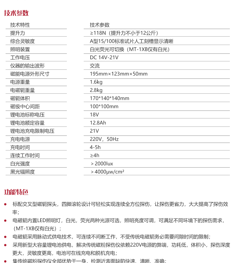 產(chǎn)品概述美泰MT-1XC/MT-1XB型便攜式旋轉(zhuǎn)磁場(chǎng)探傷儀,基于漏磁場(chǎng)會(huì)吸附磁粉的原理,通過觀察吸附磁粉的疏密程度來探傷。它標(biāo)配交叉型磁軛探頭,四腳滾輪設(shè)計(jì)可輕松實(shí)現(xiàn)連續(xù)全方位探傷,讓探傷更省力。電磁軛內(nèi)置LED照明燈,白光,熒光兩種光源可選,照明亮度可調(diào),可滿足不同環(huán)境下的探傷需求。采用大容量鋰電池組供電,為磁粉探傷提供磁化電源,解決了傳統(tǒng)磁粉探傷儀依賴220V電源的弊端,功耗低,電池可在線充電,亦可脫機(jī)充電。被廣泛的應(yīng)用于飛機(jī)制造、鍋爐壓力容器等行業(yè),是保障生產(chǎn)安全必備的專業(yè)精密儀器。