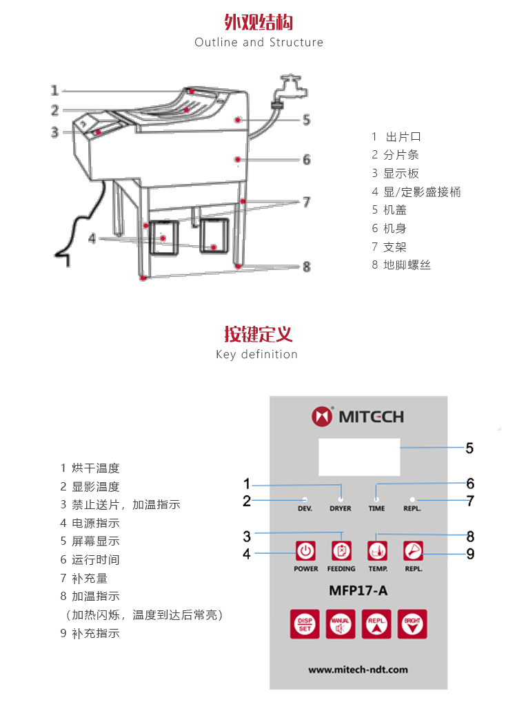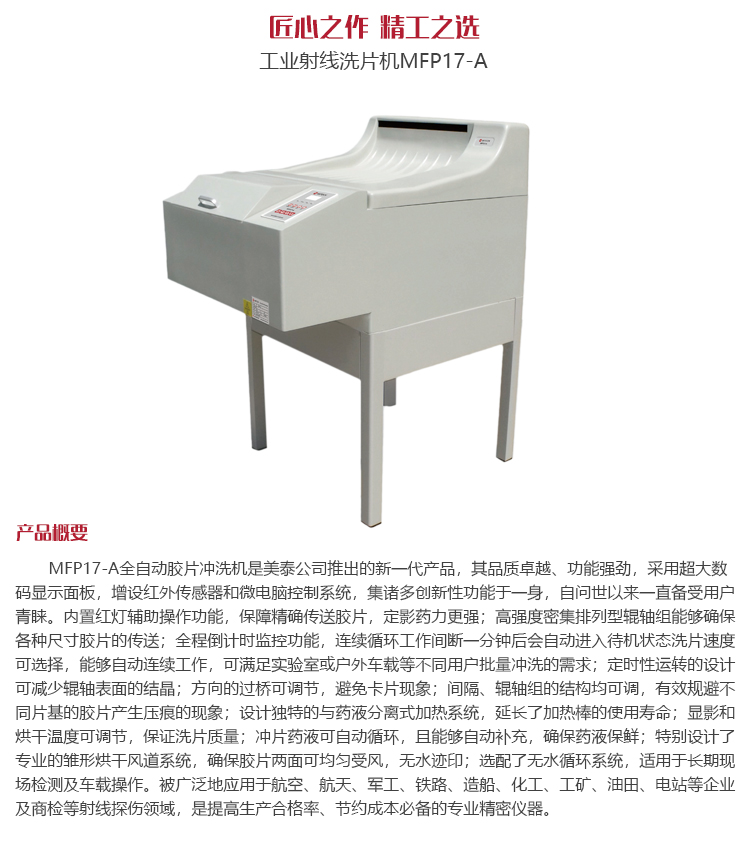 產(chǎn)品概述MFP17-A全自動(dòng)膠片沖洗機(jī)是美泰公司推出的新一代產(chǎn)品,其品質(zhì)卓越、功能強(qiáng)勁,采用超大數(shù)碼顯示面板,增設(shè)紅外傳感器和微電腦控制系統(tǒng),集諸多創(chuàng)新性功能于一身,自問世以來一直倍受用戶青睞。內(nèi)置紅燈輔助操作功能,保障精確傳送膠片,定影藥力更強(qiáng);高強(qiáng)度密集排列型輥軸組能夠確保各種尺寸膠片的傳送;全程倒計(jì)時(shí)監(jiān)控功能,使循環(huán)工作完成一分鐘自動(dòng)進(jìn)入待機(jī)狀態(tài);洗片速度可選擇,能夠自動(dòng)連續(xù)工作,滿足實(shí)驗(yàn)室或戶外車載等不同用戶批量沖洗的需求;定時(shí)性運(yùn)轉(zhuǎn)的設(shè)計(jì)可減少輥軸表面的結(jié)晶;方向的過橋可調(diào)節(jié),避免卡片現(xiàn)象;間隔、輥軸組的結(jié)構(gòu)均可調(diào),有效規(guī)避不同片基的膠片產(chǎn)生壓痕的現(xiàn)象;設(shè)計(jì)獨(dú)特的與藥液分離式的加熱系統(tǒng),延長(zhǎng)了加熱棒的使用壽命;顯影和烘干溫度可調(diào)節(jié),保證洗片質(zhì)量;沖片藥液可自動(dòng)循環(huán),且能夠自動(dòng)補(bǔ)充,確保藥液保鮮;特別設(shè)計(jì)了專業(yè)的雛形烘干風(fēng)道系統(tǒng),確保膠片兩面可均勻受風(fēng),無水跡?。贿x配無水循環(huán)系統(tǒng),適用于長(zhǎng)期現(xiàn)場(chǎng)檢測(cè)及車載操作。被廣泛地應(yīng)用于航空、航天、軍工、鐵路、造船、化工、工礦、油田、電站等企業(yè)及商檢等射線探傷領(lǐng)域,是提高生產(chǎn)合格率、節(jié)約成本必備的專業(yè)精密儀器。