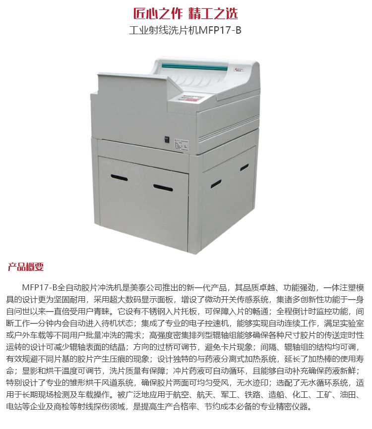 產品概述MFP17-B全自動膠片沖洗機是美泰公司推出的新一代產品,其品質卓越、功能強勁,一體注塑模具的設計更為堅固耐用,采用超大數(shù)碼顯示面板,增設了微動開關傳感系統(tǒng),集諸多創(chuàng)新性功能于一身,自問世以來一直倍受用戶青睞。它設有不銹鋼入片托板,可保障入片的暢通;全程倒計時監(jiān)控功能,間斷工作一分鐘內會自動進入待機狀態(tài);集成了專業(yè)的電子控速機,能夠實現(xiàn)自動連續(xù)工作,滿足實驗室或戶外車載等不同用戶批量沖洗的需求;高強度密集排列型輥軸組能夠確保各種尺寸膠片的傳送;定時性運轉的設計可減少輥軸表面的結晶;方向的過橋可調節(jié),避免卡片現(xiàn)象;間隔、輥軸組的結構均可調,有效規(guī)避不同片基的膠片產生壓痕的現(xiàn)象;設計獨特的與藥液分離式加熱系統(tǒng),延長了加熱棒的使用壽命;顯影和烘干溫度可調節(jié),洗片質量有保障;沖片藥液可自動循環(huán),且能夠自動補充,確保藥液新鮮;特別設計了專業(yè)的雛形烘干風道系統(tǒng),確保膠片兩面可均勻受風,無水跡?。贿x配了無水循環(huán)系統(tǒng),適用于長期現(xiàn)場檢測及車載操作。被廣泛地應用于航空、航天、軍工、鐵路、造船、化工、工礦、油田、電站等企業(yè)及商檢等射線探傷領域,是提高生產合格率、節(jié)約成本必備的專業(yè)精密儀器。