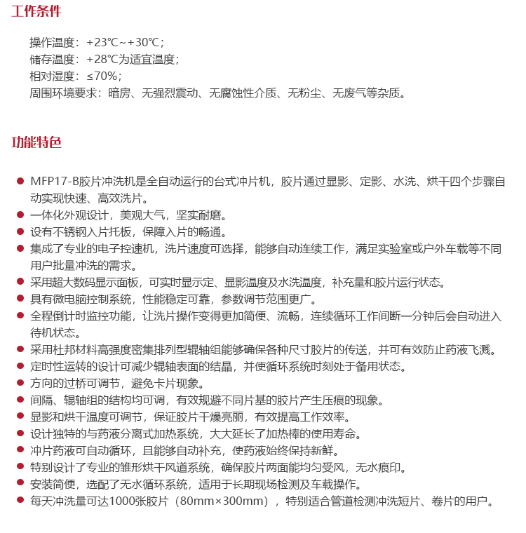 功能用途MFP17-B膠片沖洗機是全自動運行的臺式沖片機,膠片通過顯影、定影、水洗、烘干四個步驟自動實現(xiàn)快速、高效洗片。