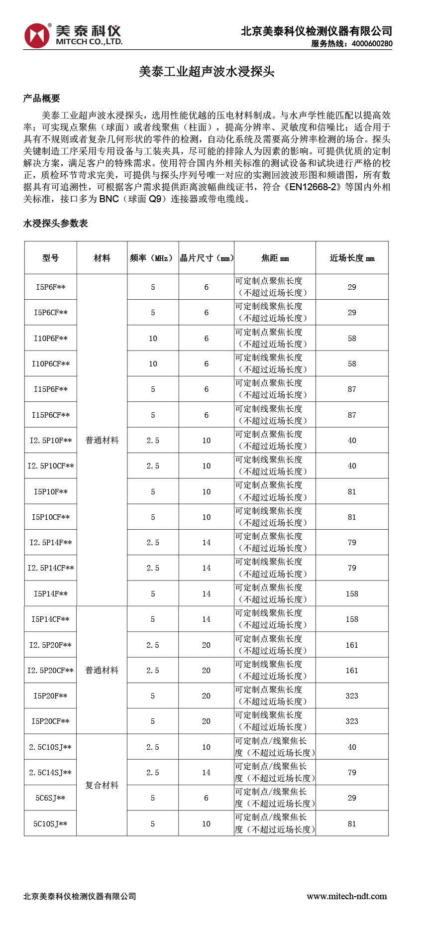產(chǎn)品概述美泰工業(yè)超聲波水浸探頭,選用性能優(yōu)越的壓電材料制成。與水聲學(xué)性能匹配以提高效率;可實(shí)現(xiàn)點(diǎn)聚焦(球面)或者線(xiàn)聚焦(柱面),提高分辨率、靈敏度和信噪比;接口多為BNC(球面Q9)連接器或帶電纜線(xiàn);適合用于具有不規(guī)則或者復(fù)雜幾何形狀的零件的檢測(cè),自動(dòng)化系統(tǒng)及需要高分辨率檢測(cè)的場(chǎng)合。探頭關(guān)鍵制造工序采用專(zhuān)用設(shè)備與工裝夾具,盡可能的排除人為因素的影響??商峁﹥?yōu)質(zhì)的定制解決方案,滿(mǎn)足客戶(hù)的特殊需求。使用符合國(guó)內(nèi)外相關(guān)標(biāo)準(zhǔn)的測(cè)試設(shè)備和試塊進(jìn)行嚴(yán)格的校正,質(zhì)檢環(huán)節(jié)苛求完美,可提供與探頭序列號(hào)唯一對(duì)應(yīng)的實(shí)測(cè)回波波形圖和頻譜圖,所有數(shù)據(jù)具有可追溯性,可根據(jù)客戶(hù)需求提供距離波幅曲線(xiàn)證書(shū),符合《EN12668-2》等國(guó)內(nèi)外相關(guān)標(biāo)準(zhǔn)