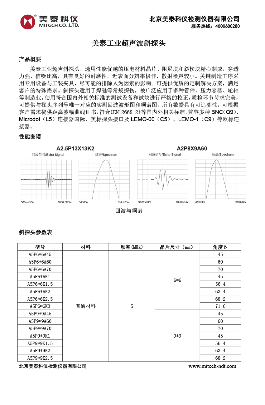 產(chǎn)品概述美泰工業(yè)超聲斜探頭,選用性能優(yōu)越的壓電材料晶片、阻尼塊和斜楔塊精心制成,穿透力強(qiáng)、信噪比高,具有良好的耐磨性,近表面分辨率極佳,散射噪聲較小。關(guān)鍵制造工序采用專用設(shè)備與工裝夾具,盡可能的排除人為因素的影響。可提供優(yōu)質(zhì)的定制解決方案,滿足客戶的特殊需求。斜探頭適用于焊縫等常規(guī)探傷,被廣泛應(yīng)用于多種管件、壓力容器、輪軸等制造業(yè)。使用符合國(guó)內(nèi)外相關(guān)標(biāo)準(zhǔn)的測(cè)試設(shè)備和試塊進(jìn)行嚴(yán)格的校正,質(zhì)檢環(huán)節(jié)苛求完美,可提供與探頭序列號(hào)唯一對(duì)應(yīng)的實(shí)測(cè)回波波形圖和頻譜圖,所有數(shù)據(jù)具有可追溯性,可根據(jù)客戶需求提供距離波幅曲線證書,符合《EN12668-2》等國(guó)內(nèi)外相關(guān)標(biāo)準(zhǔn),兼容多種BNC(Q9)、Microdot(L5)連接器國(guó)際、美標(biāo)探頭接口及LEMO-00(C5)、LEMO-1(C9)等歐標(biāo)連接器。